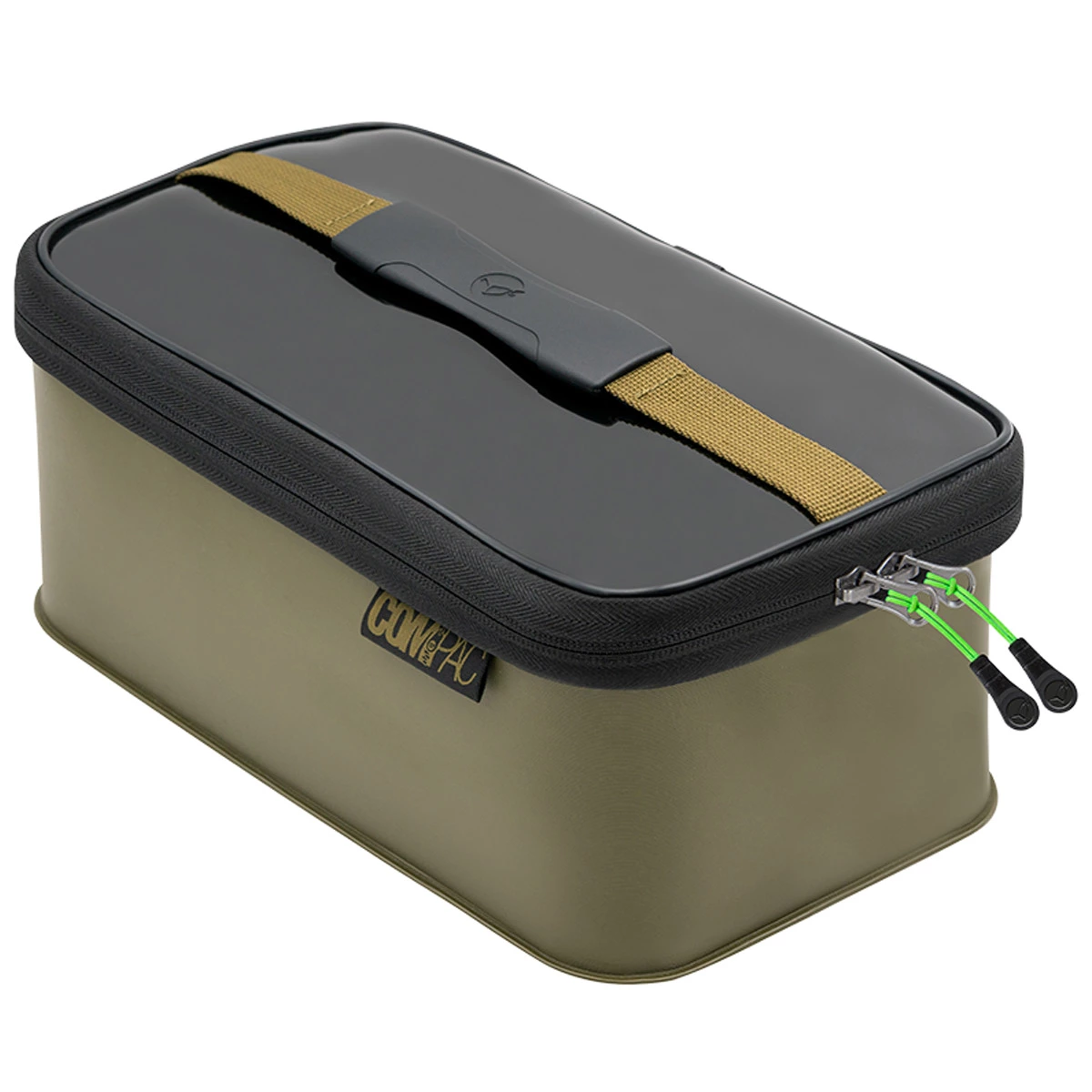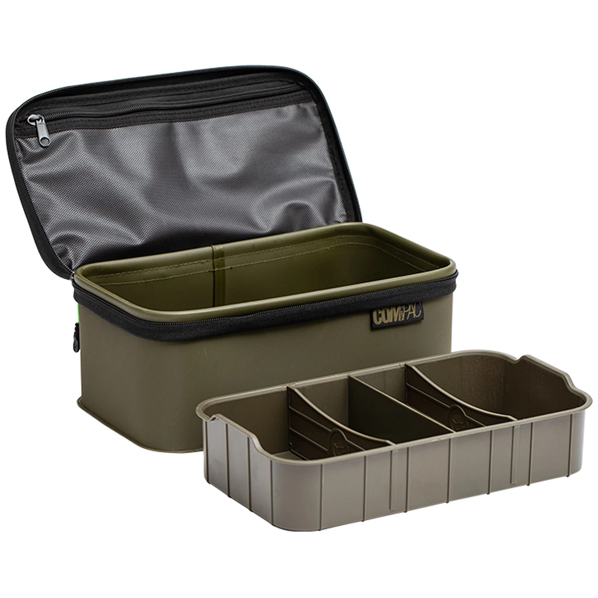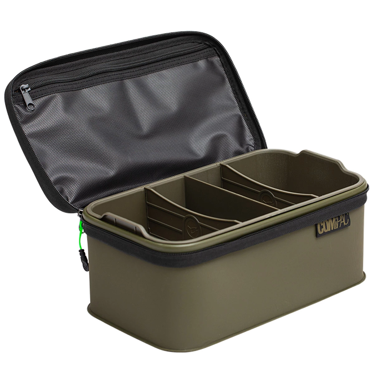 De Compac Organizer van Korda heeft een verwijderbare tray die op het frame aan de bovenkant van de tas past. Zo kan je de tray vullen met kleine end-tackle materialen en is de onderkant van het tasje geschikt voor het opbergen van grotere accessoires zoals een pva koker of een krimp tool. De tray is zo vormgegeven dat de korda producten er perfect in passen zoals de Kamakura haken, de rollen onderlijnmateraal etc, Verder beschikt de tas over een mesh vak aan de bovenzijde voor het opbergen van andere materialen.