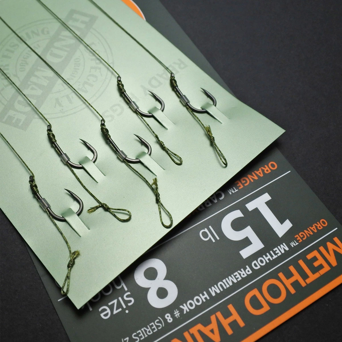 Gemak dient de mens! De Orange Method Hair rigs zijn 5 kant en klare rigs in een handige verpakking. De rigs zijn geknoopt met een soepel onderlijnmateriaal met een trekkracht van 15lb.